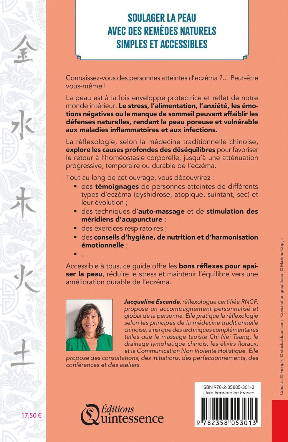 Connaissez-vous des personnes atteintes d’eczéma ?… Peut-être vous-même ! La peau est à la fois enveloppe protectrice et reflet de notre monde intérieur. Le stress, l’alimentation, l’anxiété, les émotions négatives ou le manque de sommeil peuvent affaiblir les défenses naturelles, rendant la peau poreuse et vulnérable aux maladies inflammatoires et aux infections. La réflexologie, selon la médecine traditionnelle chinoise, explore les causes profondes des déséquilibres pour favoriser le retour à l’homéostasie corporelle, jusqu’à une atténuation progressive, temporaire ou durable de l’eczéma. Tout au long de cet ouvrage, vous découvrirez : des témoignages de personnes atteintes de différents types d’eczéma (dyshidrose, atopique, suintant, sec) et leur évolution ; des techniques d’auto-massage et de stimulation des méridiens d’acupuncture ; des exercices respiratoires ; des conseils d’hygiène, de nutrition et d’harmonisation émotionnelle… Accessible à tous, ce guide offre les bons réflexes pour apaiser la peau, réduire le stress et maintenir l’équilibre vers une amélioration durable de l’eczéma.